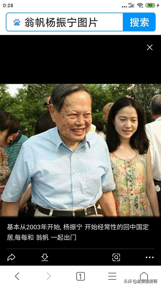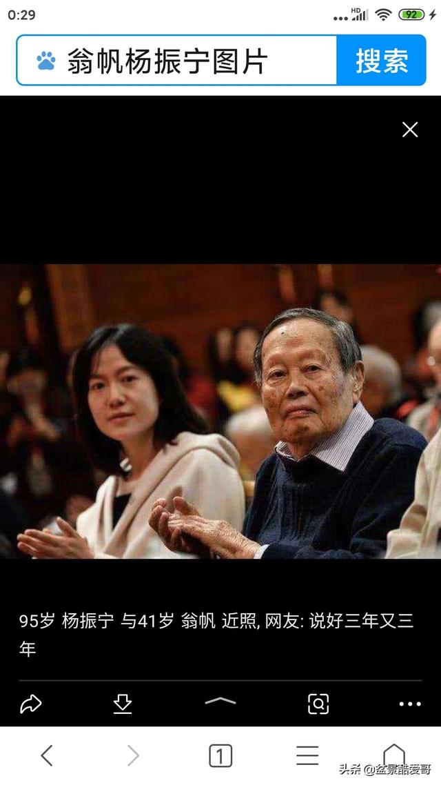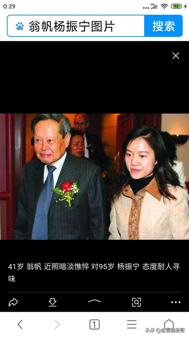 这几天正好想到杨振宁。关于这段婚姻很多人颇有微词,甚至极尽讽刺之能事。其实想想杨振宁,科学成就已达世界巅峰,而同时为人谦虚低调,身体又很健康,我敬仰还来不及,这些还不能抵消年龄问题?。。