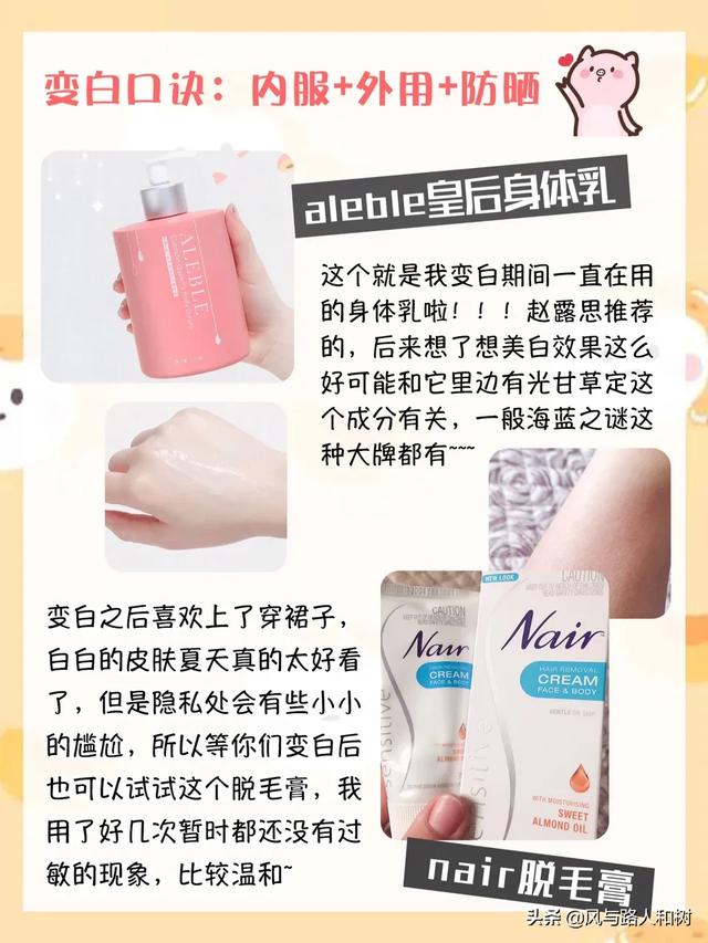 aleble皇后身体乳:这个就是我变白期间一直在用的身体乳啦!!!赵露思推荐的,后来想了想美白效果这么好可能和它里边有光甘草定这个成分有关,一般海蓝之谜这种大牌都有~~~