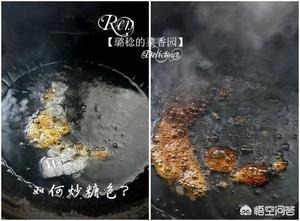 做锅热油,趁油还没有热的时候,丢4、5粒冰糖进去,小火。当油中泛起小泡沫,颜色慢慢加重,转为浓褐色。