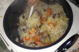 放入电饭锅,按下开关,煮到米饭快要好,但还没好的时候打开。(如果电饭锅是中途无法打开的那种,就等煮好后再操作后面的步骤)