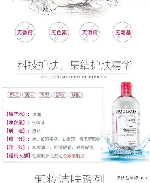 贝德玛卸妆水由法国崭新科技MICELLE配方组成,分为粉水和蓝水两类。率先使用胶束技术使洁肤液成为划时代意义的全新洁肤产品。贝德玛洁肤液采用亲肤清洁成分:脂肪酸甘油酯与离子表面活性剂不同,能与皮肤细胞壁的双层磷脂结构完全匹配,所以是一种仿生技术。当液体里的甘油酯达到一定临界浓度的时候,它们形成一个球状大分子。这种结构叫做胶束团,具有出众的深层清洁能力。