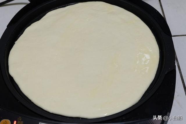 9.电饼铛通上电预热,上下盘加热,先在底盘刷一层薄油,把擀好的饼放进去,表面再刷一层薄油。
