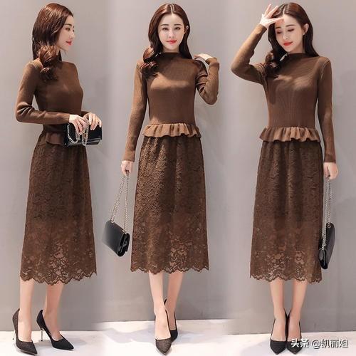 大地色系沉着稳重特别适合这个年龄段,修身的毛衣和蕾丝裙的拼接时尚减龄,非常适合初春的季节,腰间独特的木耳花边,显瘦又洋气,慵懒的头发散发着浓浓的女人味,搭配一双尖头跟鞋很显高级感。