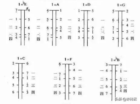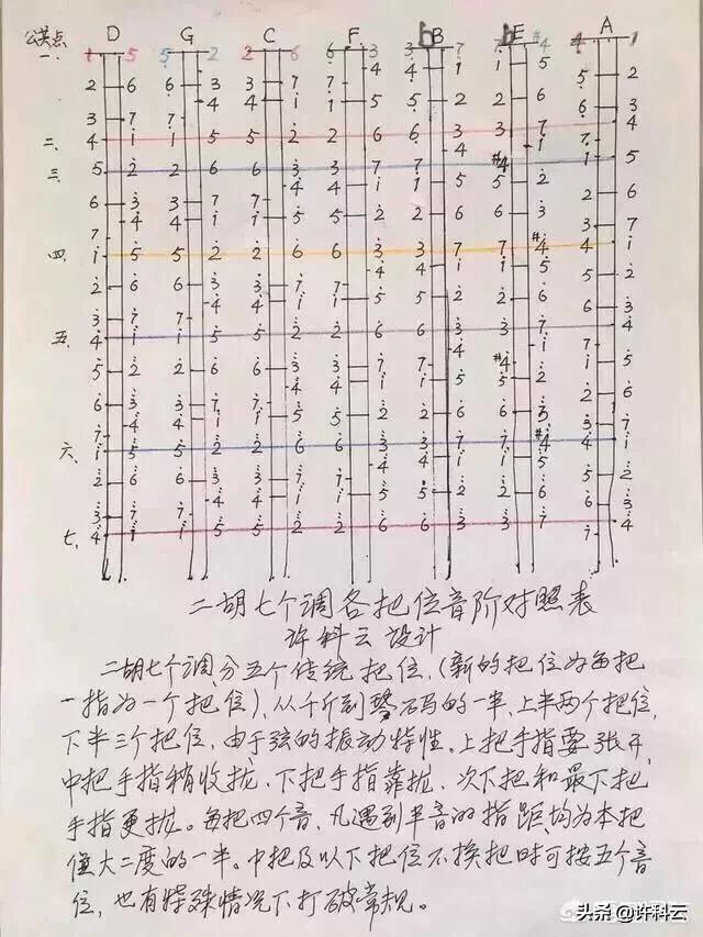6??因为二胡标准定d1~a1弦后,要把内空弦分别作七个音来定调,1=?什么音就叫首调,你看下图,上把的六个调,想想1234567在内外弦不同的位置!